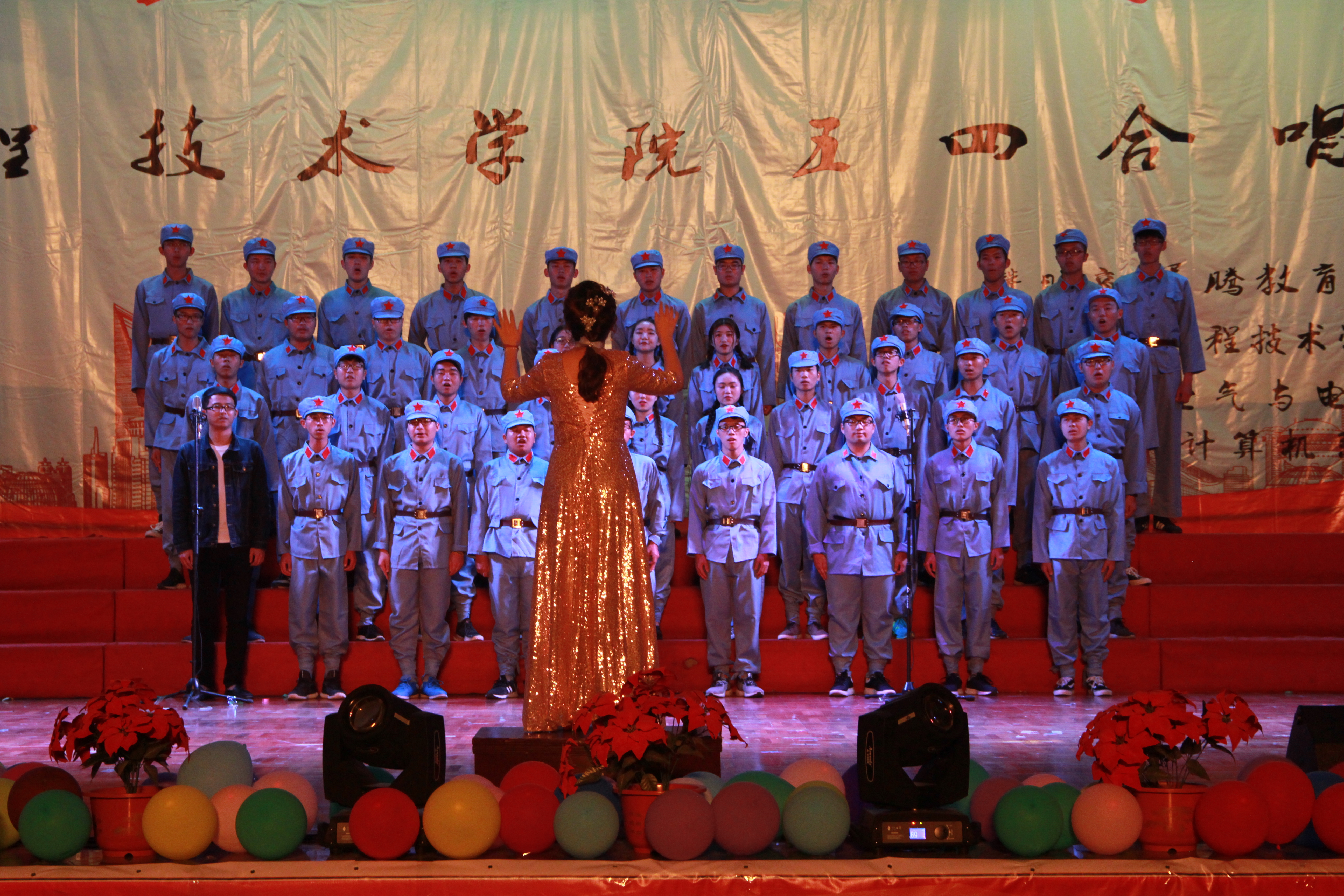 15电气3班 “一句话,一辈子,一生情,一杯酒”短短的四个词,道尽在仰恩生活中《朋友》的珍贵。16电气2班用一首《中国人民解放军军歌》唱出了人民军队一往无前、无坚不摧的革命精神,塑造了中国人民解放军肩负历史重托,为中华民族的解放英勇奋战的英雄形象,赢得观众的满堂喝彩。17电子1班《保卫黄河》,同学们昂首挺胸,采用采用齐唱、轮唱的演唱形式,振奋人心的音调、响亮的战斗口号、铿锵有力的节奏,党旗飘扬,让在场的师生们感受到游击健儿端起土枪洋枪、挥动大刀长矛,在青纱帐里、万山丛中,为保卫黄河、保卫全中国而战斗的壮丽场景。16网络工程1班一首《国家》,为我们营造了一种爱国爱家的温馨的氛围。歌曲最后,横幅上的“感谢团体,感谢有你”,表现了新一代青少年感恩之心,报答之心,小家大家,发愤图强,报效国家的豪情壮志。