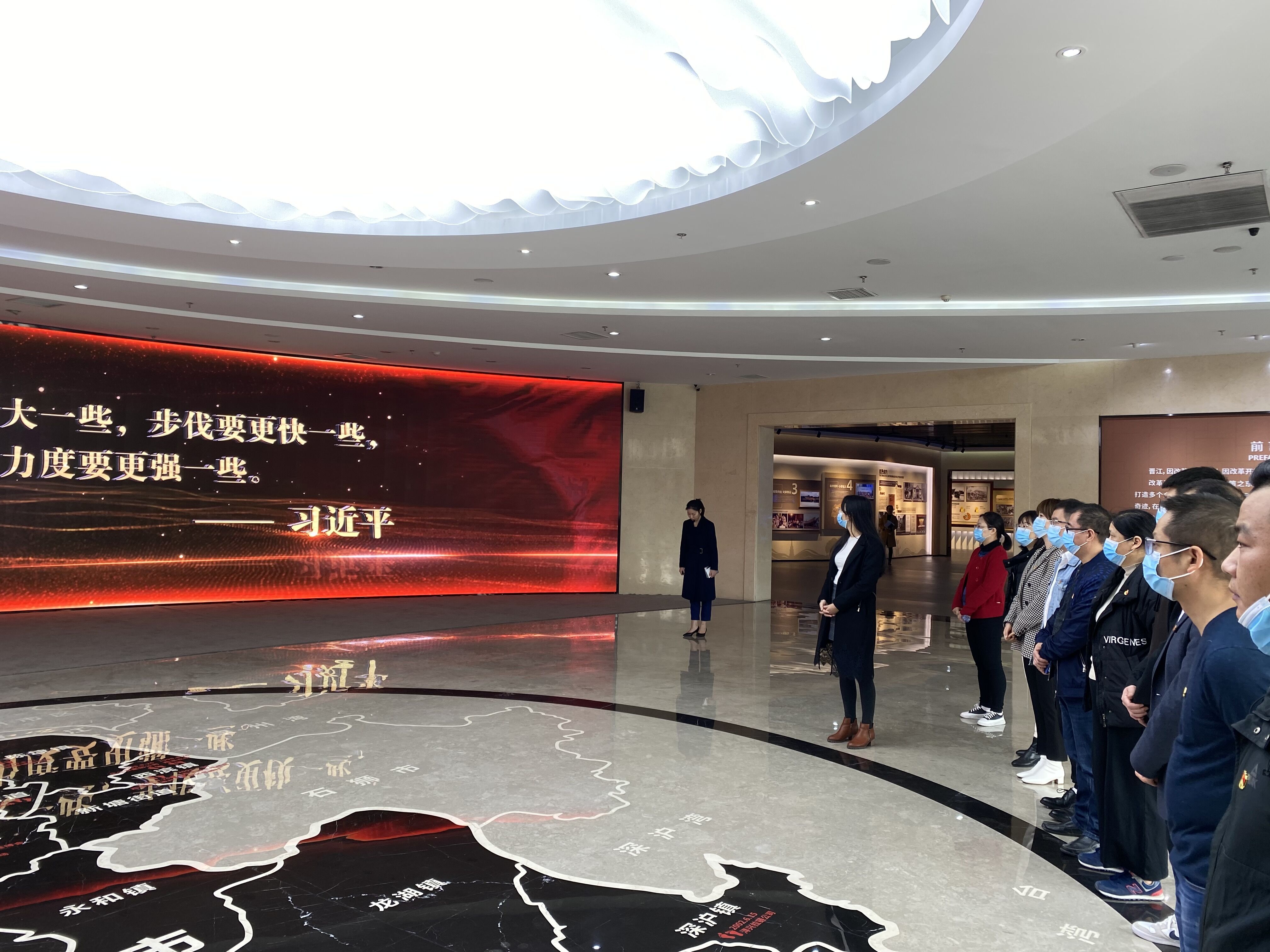在晋江市展馆,全体参观人员跟随着讲解员的脚步,观看习近平总书记《七到晋江》《习近平讲述的晋江故事》等相关视频,边听边看,重温晋江的城市发展历史和文化底蕴,了解了晋江由来、历史背景、区位优势、自然风貌、多元文化、红色动力等模块,实地观赏晋江3D景观鸟瞰模型以及晋江品牌。