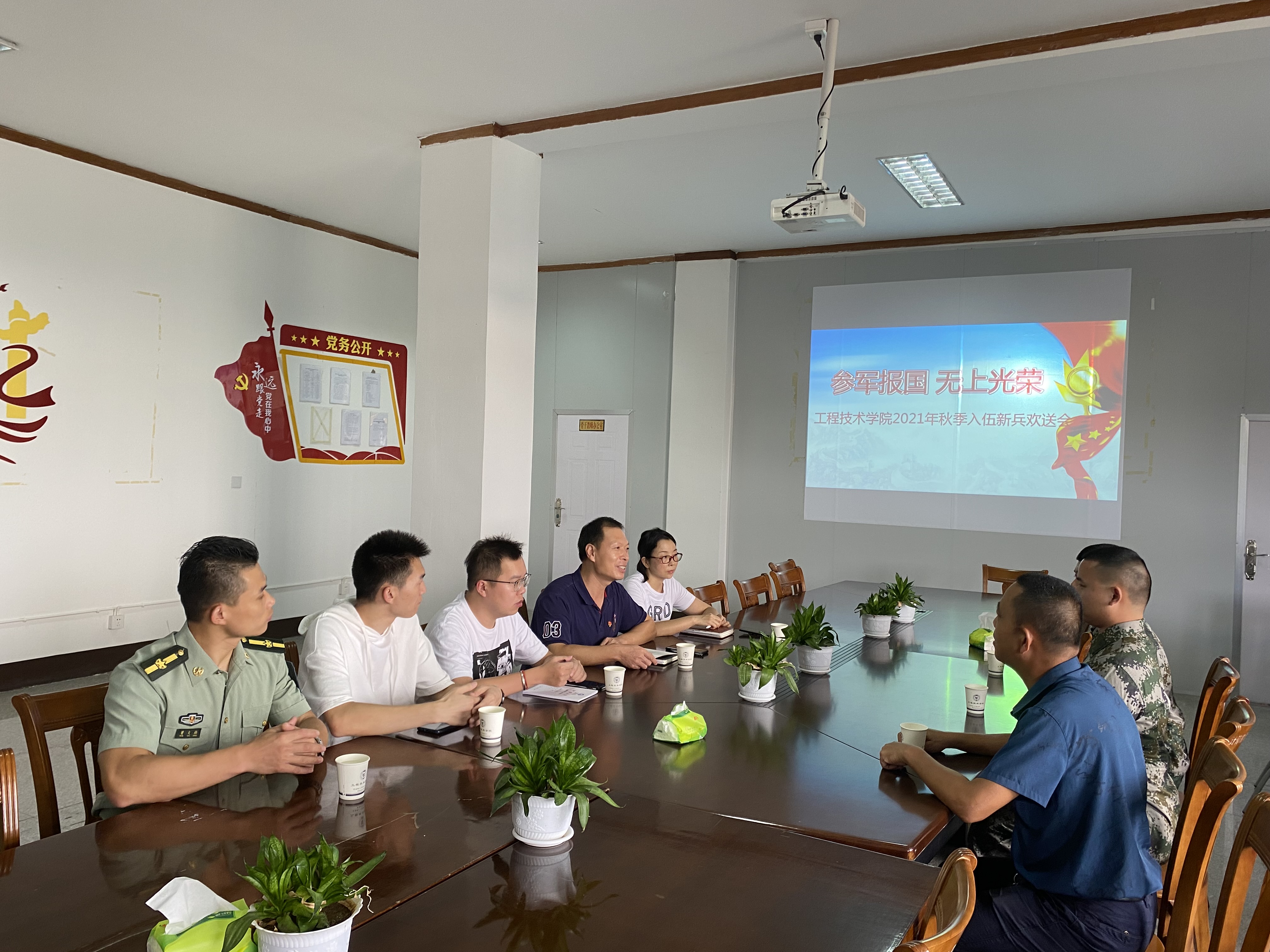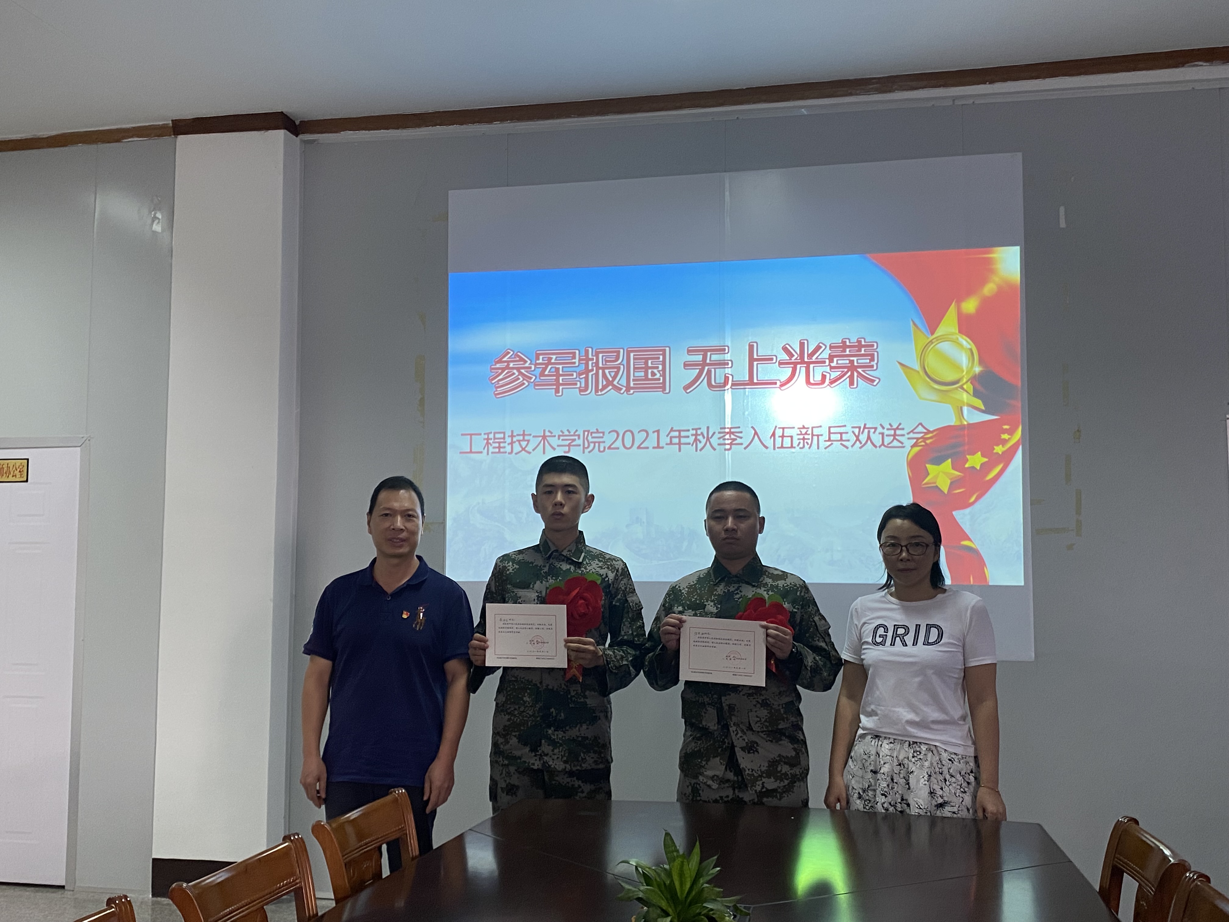 9月9日下午,开云kaiyun官网2021年直招士官入伍欢送会在泽钏楼四楼举行,欢送陈杰松、黄伟龙两位同学应征入伍。学院党总支书记曾凤生、副院长李影、党总支副书记吕思仁、校武装部曾文档等老师出席了欢送会。