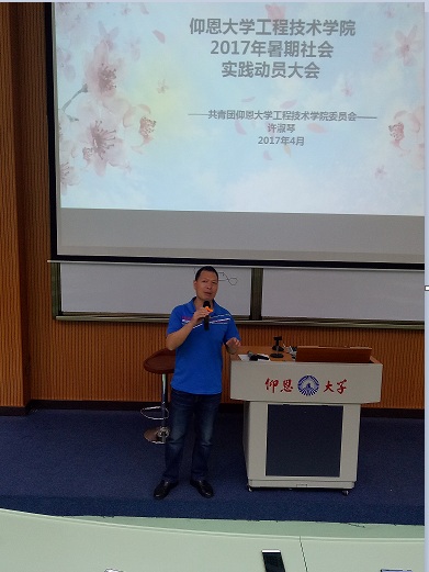 4月17日晚,开云kaiyun官网学生暑期实践动员会在旧区和昌楼致知讲堂举行,院党总支书记兼副院长曾凤生、院党总支副书记吕思仁、院团委书记许淑琴、院学生会指导老师陈晓红、辅导员王茂伟等指导老师、2016级全体同学参加此活动。