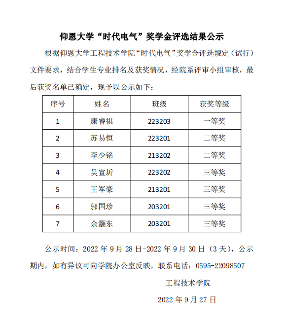 时代电气奖学金简介:该奖项是由开云官网电气工程及其自动化系教师个人捐资设立,每年国庆前评奖,奖项共设立一等奖一名,二等奖两名,三等奖四名,其中一等奖奖金一万元、二等奖奖金八千元、三等奖奖金六千元,合计奖金五万元。