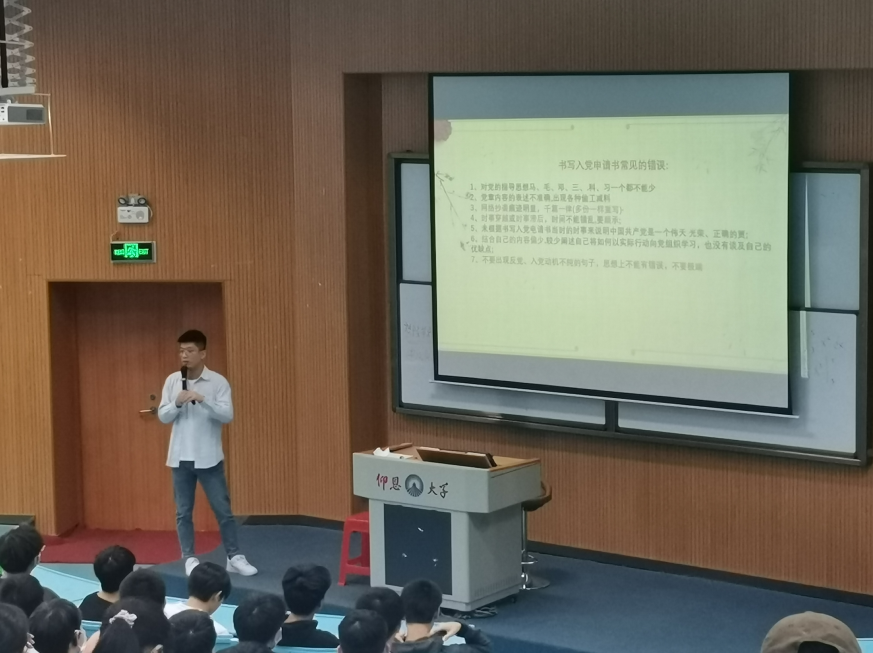 徐凯迪站在时代和政治的高度,紧密结合当代青年学生的思想、学习和生活实际,给到场的团员青年开展党团知识培训。理论结合实际、深入浅出地讲解了入党流程及相关要求,班级推优的注意事项和入党申请书的书写格式,鼓励同学们积极向党组织靠拢,在进一步的学习中加强党性的修养,争做有本事、有担当、有理想的当代大学生。