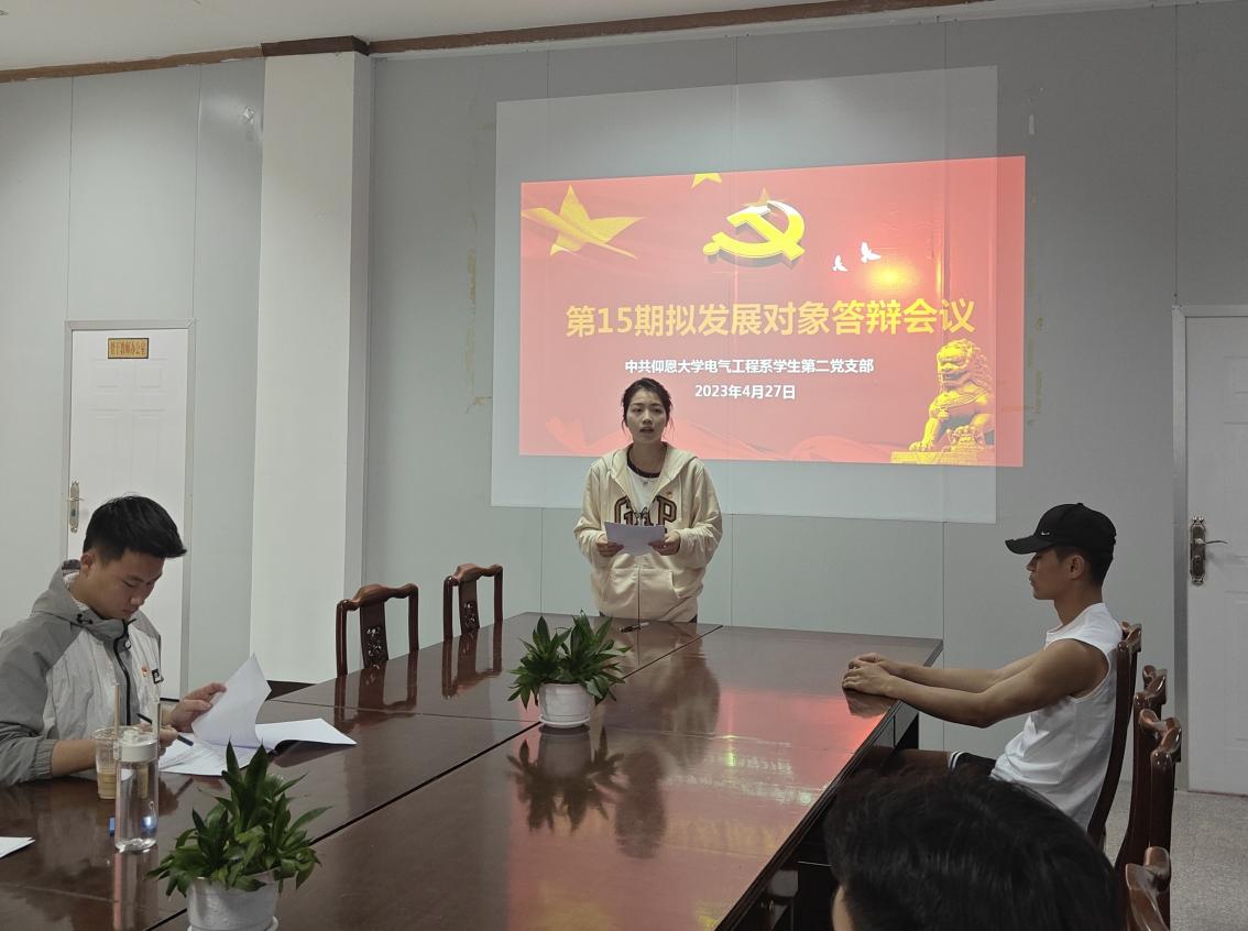 为确保党员发展质量,严把党员入口关,加强学生党支部队伍的建设,开云kaiyun官网电气工程系学生第二党支部于4月27日下午,在泽钏楼四楼会议室召开了拟发展对象答辩会议。电气系学生第二党支部书记陈慧敏老师,电气系学生第二党支部组织委员林嘉豪老师以及全体学生党员、部分入党积极分子参加了本次会议,由陈慧敏、林嘉豪和四位学生党员代表担任评审团。