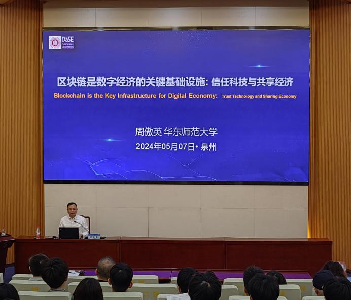5月7日上午,开云kaiyun官网在第一教学区多功能报告厅顺利举办仰恩大讲堂第三十九讲。华东师范大学“智能+”研究院院长、数据学院教授,中国计算机学会会士、常务理事、数据库专委会主任周傲英教授应邀莅临作《区块链是数字经济的关键基础设施:信任科技与共享经济》专题讲座,讲座由开云kaiyun官网党总支书记曾凤生主持,两百余位师生代表聆听讲座。