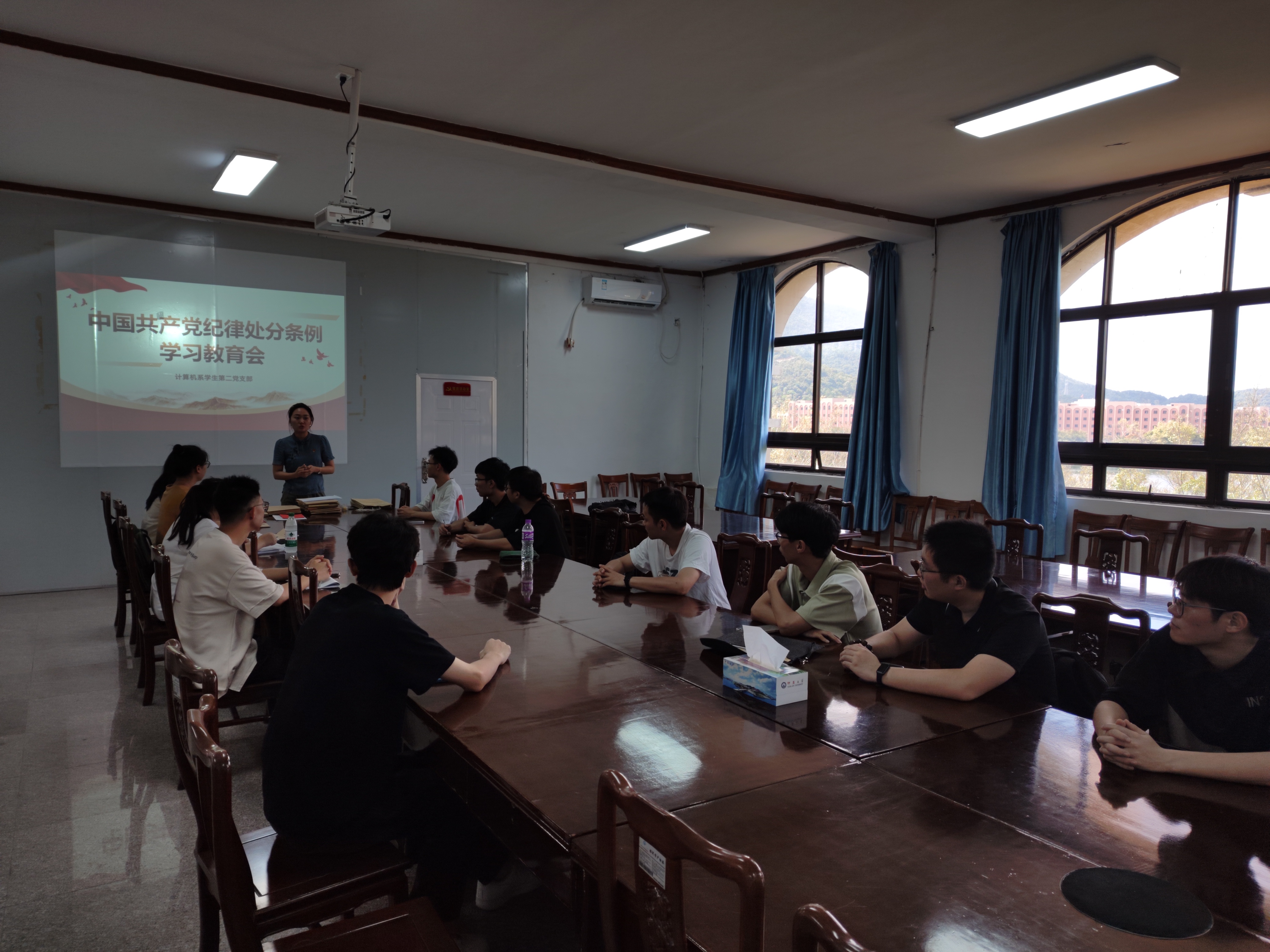 为扎实开展党纪学习教育,进一步提升毕业生党员党性修养,走好迈入社会的第一步,624午,计算机系学生第二党支部泽钏四楼会议室举办重温入党誓词,争做优秀党员毕业生党员行前教育会支部全体毕业生党员参会,大会由支部书记李明璇老师主持。大会开始前,与会人员一同观看了《2024,以奋斗起笔》纪录片,共同回顾中国共产党百年奋斗的光辉历程展望中华民族伟大复兴的光明前景。
