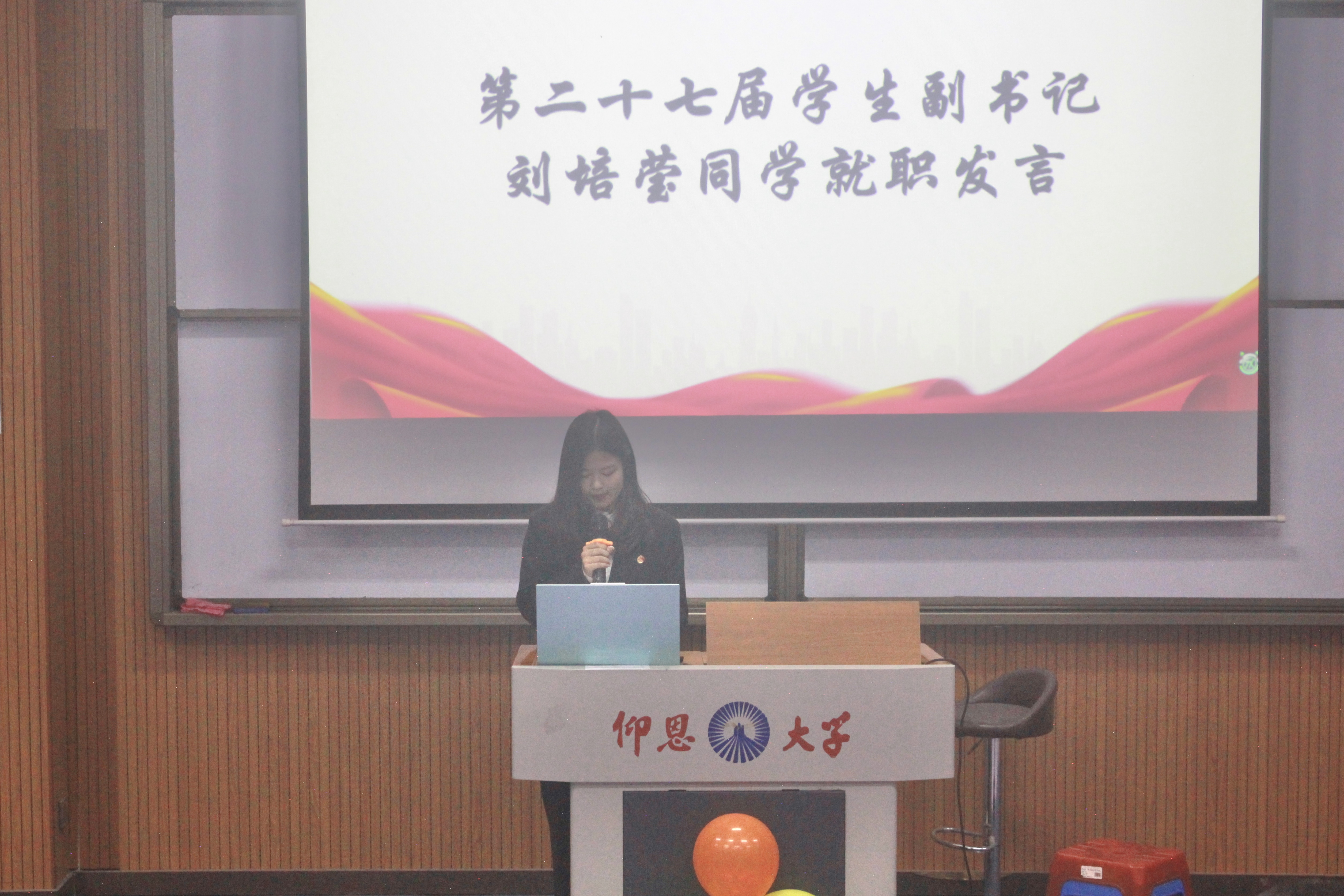 紧接着,第二十七届学生副书记刘培莹进行就职发言。她表示将不负众望,带领新一届团委成员传承优良传统,积极探索创新,努力为同学们服务,为学院发展贡献青春力量。