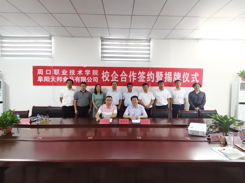 8月27日上午,副校长许永安带领教务处处长付晓东、招生就业处处长武金娟、pp模拟器游戏官网入口党总支书记李民、pp模拟器游戏官网入口院长李嘉和相关人员,一行7人到阜阳天邦食品有限公司参加产教融合签约及揭牌仪式。