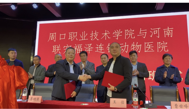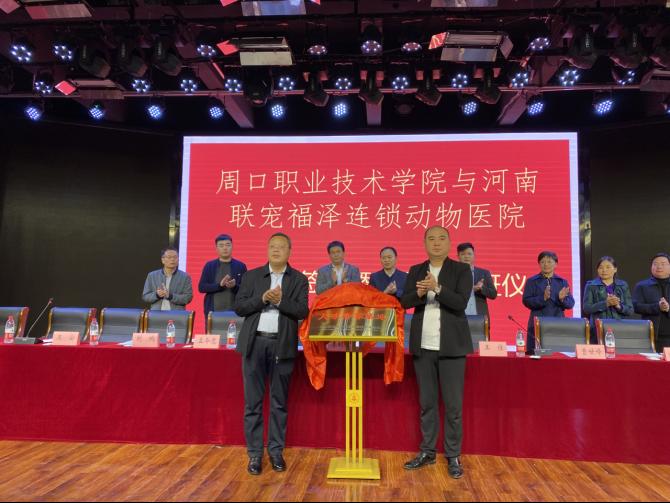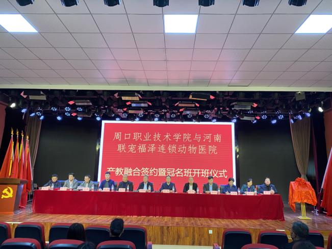 为进一步推进校企合作、产教融合工作。pp模拟器游戏官网入口与河南联宠福泽连锁动物医院产教融合签约暨冠名班开班仪式于10月12日上午8点在艺术学院演播厅隆重举行。副校长李明臣、pp模拟器游戏官网入口党总支书记李民、招生就业处处长武金娟、教务处相关负责人、pp模拟器游戏官网入口班子成员、河南联宠福泽动物医院连锁有限公司总经理王佳一行四人、教师代表及冠名班全体学生参加本次活动。签约暨冠名班开班仪式由副院长王安主持。