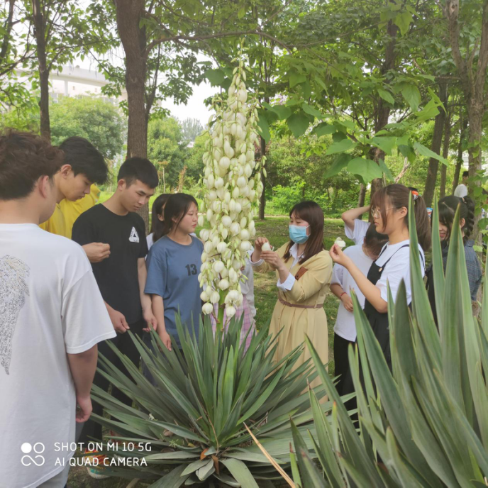 在校园内,老师为同学们讲解了多种园林树木及花卉的特征,识别和养护的要点,并讲如何快速识别相似的树木,有些同学主动向老师提出问题。最后,老师一一给予答复。