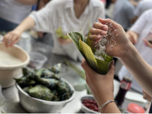 大家欢声笑语、其乐融融。手巧的学生们折粽叶、放馅儿、填糯米、扎线绳一气呵成,不太熟练的学生们则虚心向老师们求教。