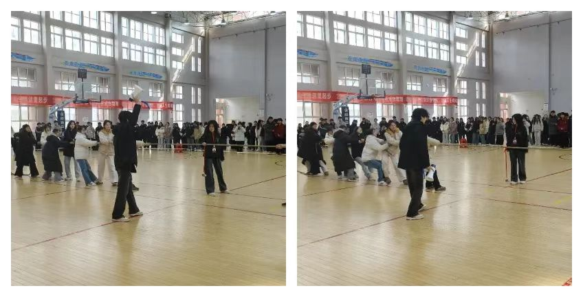 赛场上,同学们热情高涨,积极参与各个项目。五人六足中,大家喊着整齐的口号,步伐一致地奋力向前;拔河比赛现场气氛热烈,双方队员都使出浑身解数,你来我往,互不相让;蒙眼踢球环节更是笑声不断,参与者蒙着眼睛在场上摸索踢球,状况百出;跳绳游戏里,选手们轻盈跳跃,展现出别样的活力与风采。