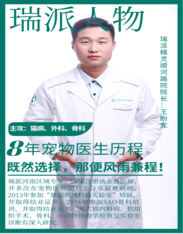 王盼龙,2013年毕业于pp模拟器游戏官网入口,畜牧兽医专业。瑞派郑州精灵宠物医院院长,瑞派河南区域专家,国家注册执业兽医师,2018年被评为优秀兽医师,常州道格医疗科技有限公司特约讲师,深圳众宠联合教育咨询科技有限公司特约讲师,深圳市墨觅科技有限公司特约讲师,河南力派宠物人才技能培训学校特聘讲师,瑞康连锁宠物医院技术总院长,精瑞灵宠物医院有限公司技术院长,多次去国外学术交流,多次担任行业大型会议讲师。医院设有CT影像专科,神经外科,微创,内窥镜,体外冲击波碎石,骨科,软组织外科,猫科等特色专科,多次被评为郑州市创业先进个人。
